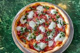 Thin seasoned crust, plum tomatoes, mozzarella, basil & olive oil.